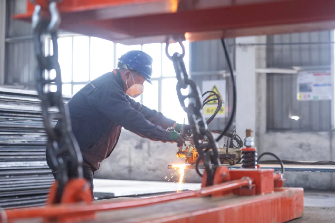 在木壘泰勝風(fēng)能裝備有限公司車間,工人在切割鋼板。何龍攝