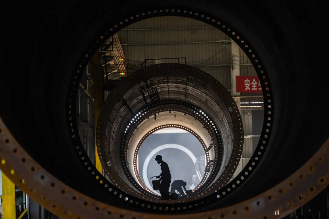在木壘泰勝風(fēng)能裝備有限公司車間,工人在生產(chǎn)線上生產(chǎn)風(fēng)力發(fā)電機塔筒。何龍攝