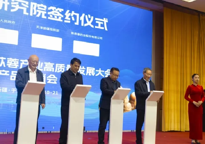 會(huì)議上,天津前指項(xiàng)目招商部副部長(zhǎng)趙建輝,于田縣委副書記、人民政府縣長(zhǎng)木合塔爾·買提尼牙孜與北京大學(xué)中醫(yī)藥現(xiàn)代研究中心主任、肉蓯蓉研究首席專家屠鵬飛,新疆維吾爾自治區(qū)藥品工業(yè)協(xié)會(huì)會(huì)長(zhǎng)、新奇康藥業(yè)股份有限公司董事長(zhǎng)陳金成簽署了合作協(xié)議。這一合作協(xié)議的簽署,標(biāo)志著于田縣肉蓯蓉產(chǎn)業(yè)在科研創(chuàng)新方面邁出了堅(jiān)實(shí)的一步,將為肉蓯蓉產(chǎn)業(yè)的高質(zhì)量發(fā)展提供強(qiáng)大的技術(shù)支持。