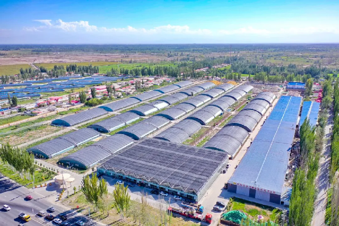 疏勒縣魯疆情食用菌生態(tài)科技示范園內(nèi)種植大棚。