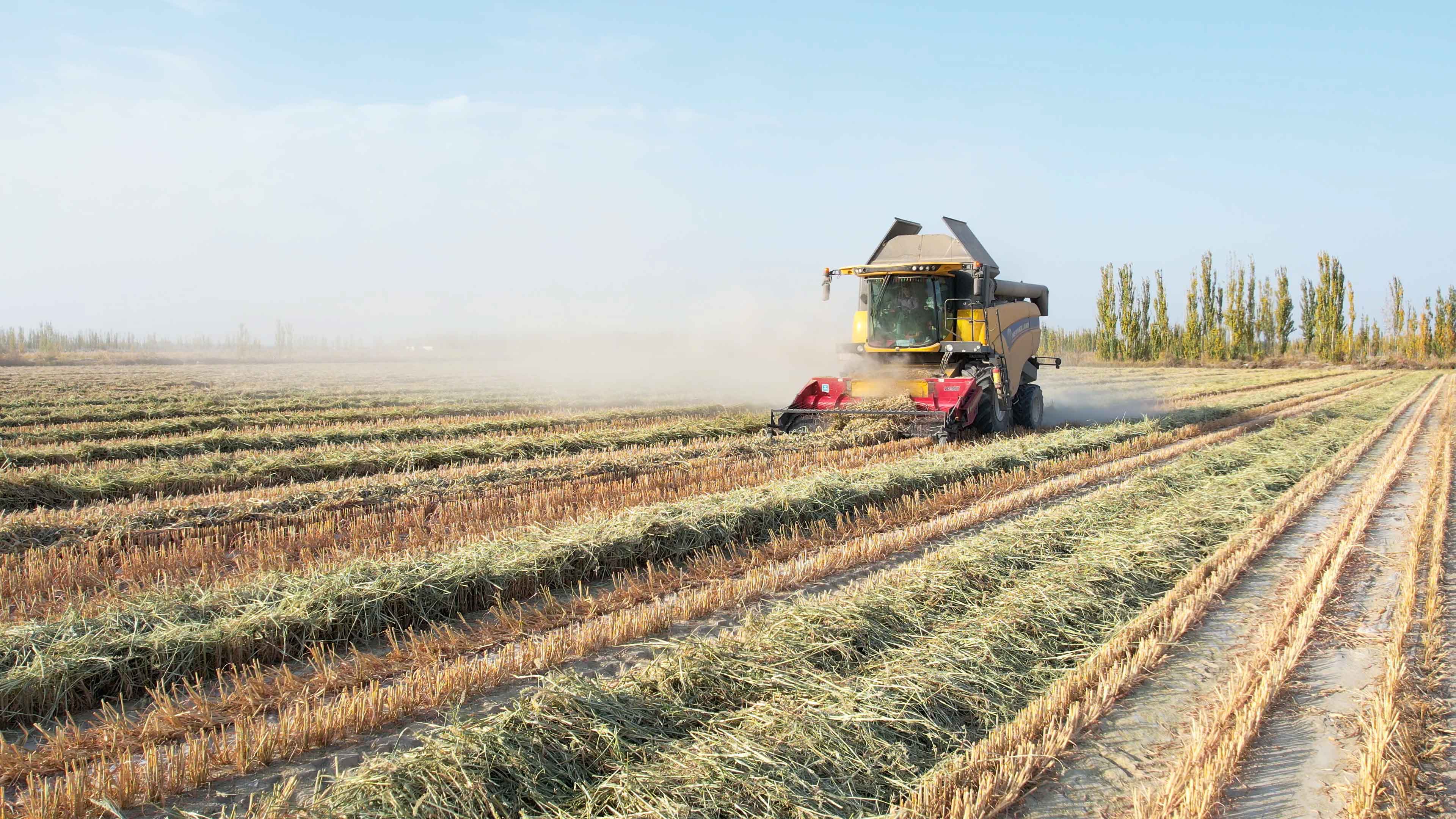 10月31日,在新和縣塔木托格拉克鄉(xiāng)塔木托格拉克村的小米種植收獲大田里,一邊是收割機(jī)將飽滿的谷穗卷入機(jī)器,成行傾倒在地上進(jìn)行晾曬等待脫粒;另一邊則是脫粒機(jī)將晾曬好的谷穗卷入脫粒倉進(jìn)行脫粒作業(yè),只見金黃的谷粒從脫粒機(jī)的漏斗中傾瀉而下,裝入車中……現(xiàn)場(chǎng)呈現(xiàn)一派繁忙的收獲景象。