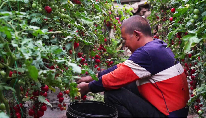 立冬過(guò)后,天氣漸冷,拜城縣康其鎮(zhèn)和諧村蔬菜溫室大棚里卻是一片暖意融融,成熟的圣女果像一個(gè)個(gè)火紅的小燈籠點(diǎn)綴在綠油油的藤蔓間,長(zhǎng)勢(shì)甚是喜人。種植戶潘祥偉正在大棚里忙活,采摘、裝箱……不一會(huì)兒,紅彤彤的果實(shí)就裝滿了幾大箱。