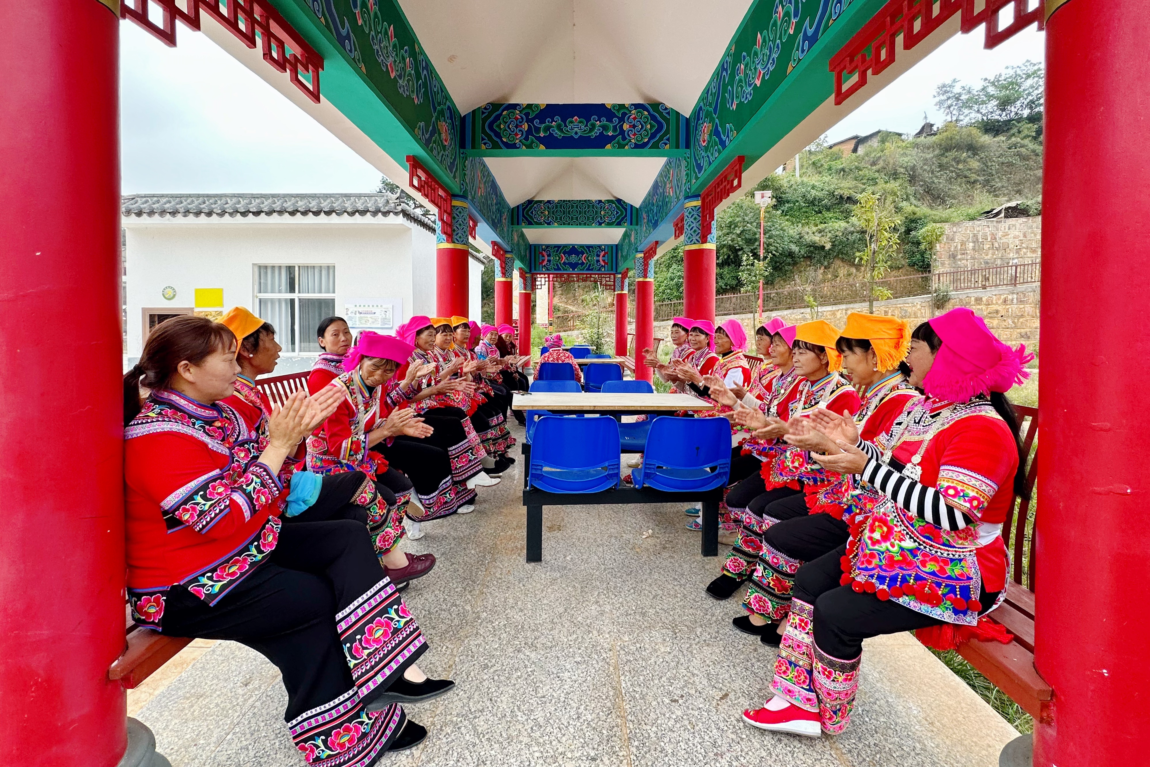 (彝族群眾在文化長(zhǎng)廊里對(duì)唱山歌。紅塔區(qū)融媒體中心供圖)