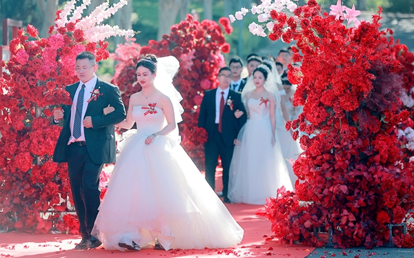 在集體婚禮現(xiàn)場(chǎng),11對(duì)新人盛裝出席,在證婚人、現(xiàn)場(chǎng)觀禮嘉賓和同事們的見證祝福下,互宣愛的誓言、甜蜜相擁相吻、交換愛的信物,一生一世,白首不離。