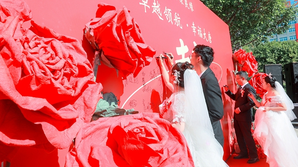 新人們紛紛在簽名墻前拍照留念,在鏡頭下說出愛的告白,在簽名墻上寫下“白頭偕老”“相濡以沫”“幸福美滿”等寄語,留下愛的印記。