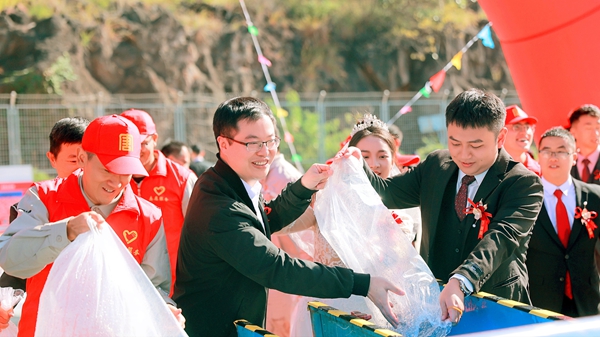 婚禮還精心準(zhǔn)備了魚類放流儀式,11對(duì)新人一起放流了珍稀魚苗,魚苗入水的瞬間,濺起了一串串晶瑩的水花,仿佛是大自然奏響的歡快音符。清澈的水面倒映著新人們微笑的面容,他們注視著魚苗離去的方向,眼中滿是溫柔。此次放流,是新人們對(duì)生物多樣性保護(hù)的有力踐行,每一條魚苗都是生命的希望,它們將在這片水域繁衍生息,為生態(tài)平衡貢獻(xiàn)力量。寓意著新人的愛情,在歲月長河中生根發(fā)芽,在愛的滋養(yǎng)下永恒而美好。