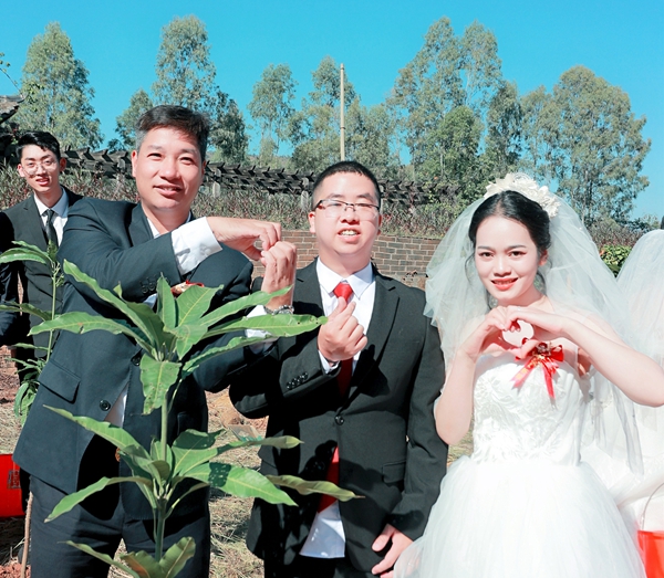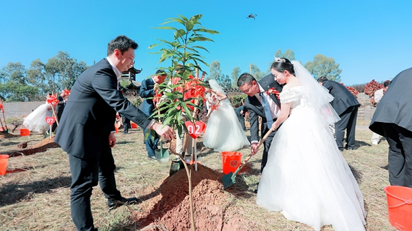 揮鍬鏟土、栽植樹苗、澆水灌溉……在主儀式結(jié)束后,新人與現(xiàn)場(chǎng)來賓們共同前往觀音巖水電站營地植樹區(qū),滿懷喜悅地栽種“同心林”。11對(duì)新人攜手種下小樹苗,讓心愿與樹苗一起生根發(fā)芽,寓意婚姻同樣需要如培育樹苗般用心經(jīng)營。這些樹苗也將隨著時(shí)間越發(fā)茂盛,開花結(jié)果,象征著新人們的愛情長長久久。