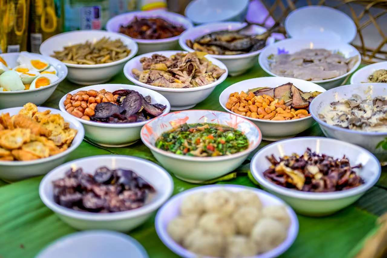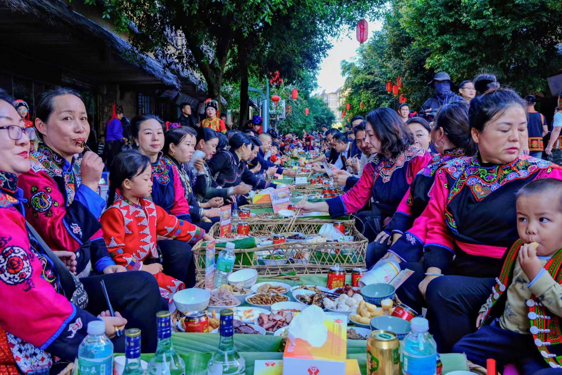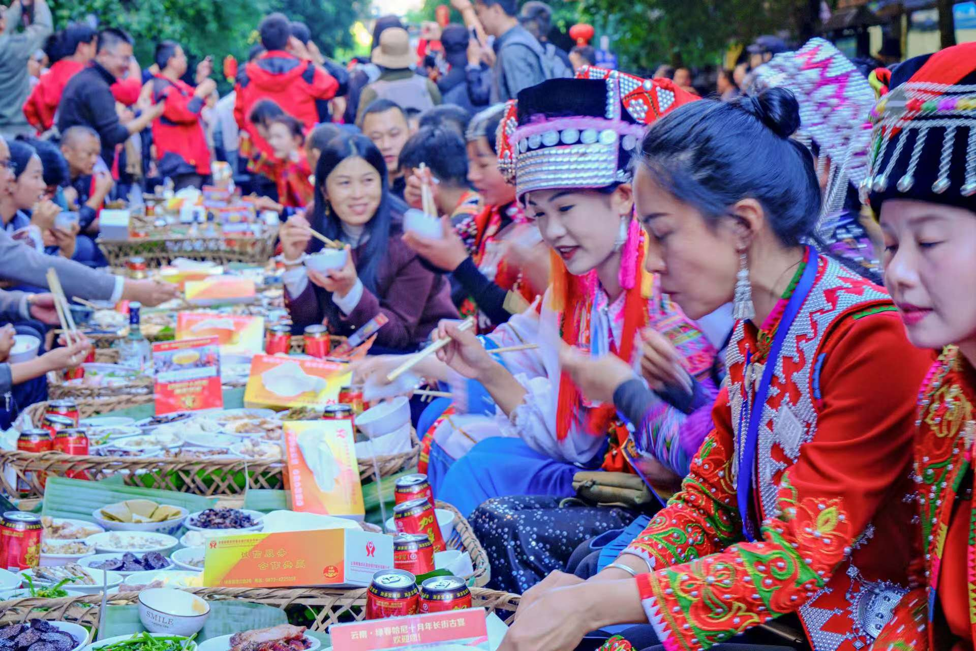 當(dāng)天下午,榮獲上海大世界吉尼斯世界之最“天下最長的宴席”之稱的哈尼長街古宴正式開席。3200桌哈尼宴席一字排開,宛如長龍般貫穿整個(gè)綠春縣城,場面蔚為壯觀。桌上擺滿了哈尼蘸水雞、竹蟲、蕎粑粑、稻花魚、梯田咸鴨蛋、牛干巴、臘肉等哈尼族特色美食,讓游客們大飽口福。大家圍坐在一起,舉杯共飲,共享美食,歡聲笑語充斥著整個(gè)縣城。