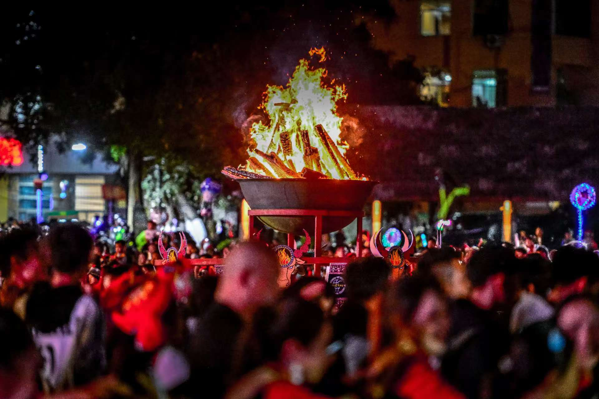 夜幕降臨后,廣場上點(diǎn)起了熊熊篝火,大家唱著、跳著,盡情釋放著內(nèi)心的喜悅。這場篝火晚會(huì)將長街宴的氣氛推向了高潮,大家心手相牽,共同祝愿偉大的祖國繁榮昌盛,民族團(tuán)結(jié)之花遍地綻放。