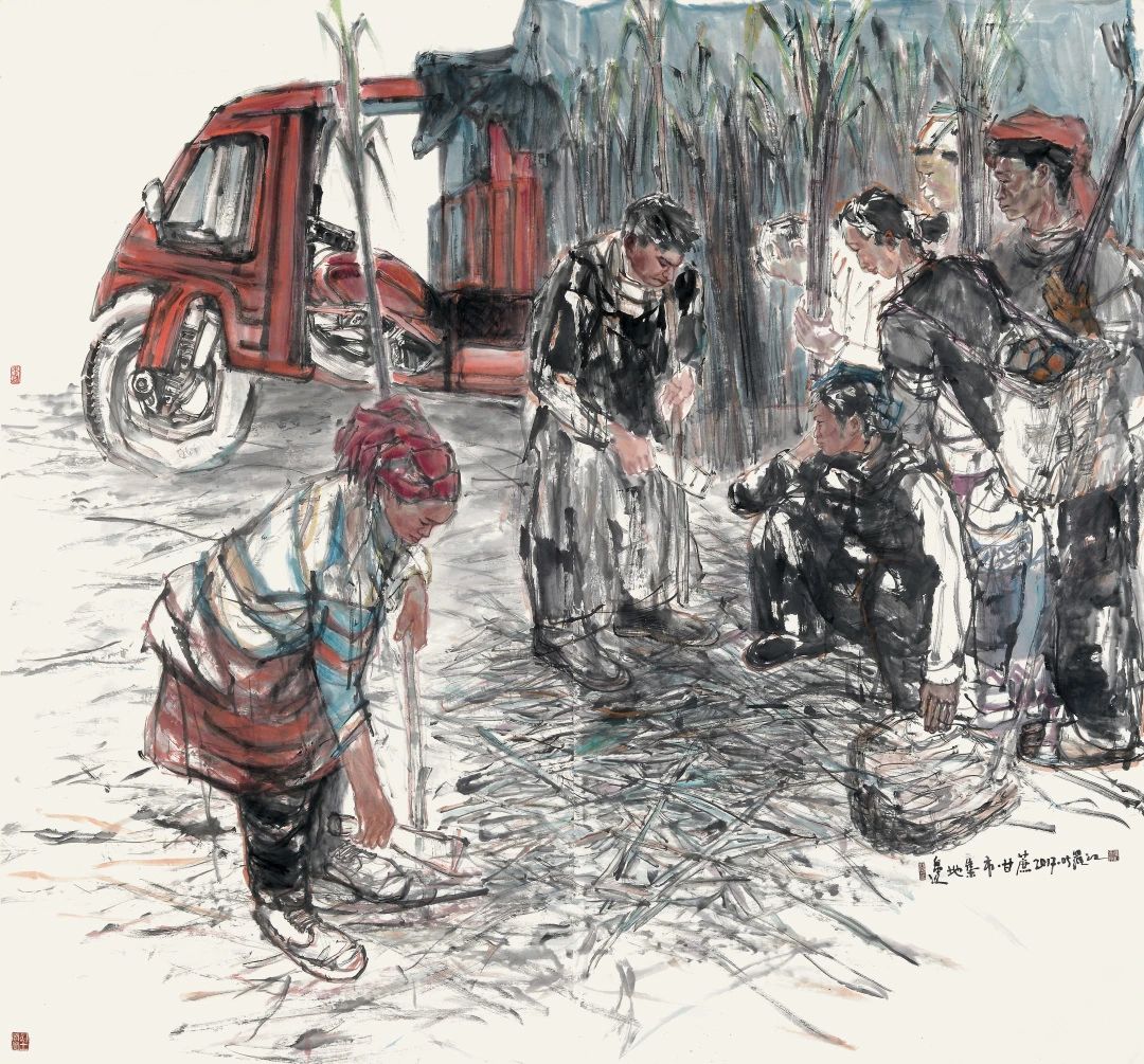 (《邊地集市.甘蔗》200x200㎝,紙本水墨,2017)