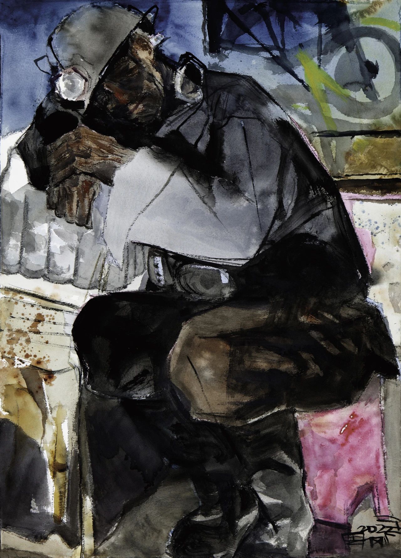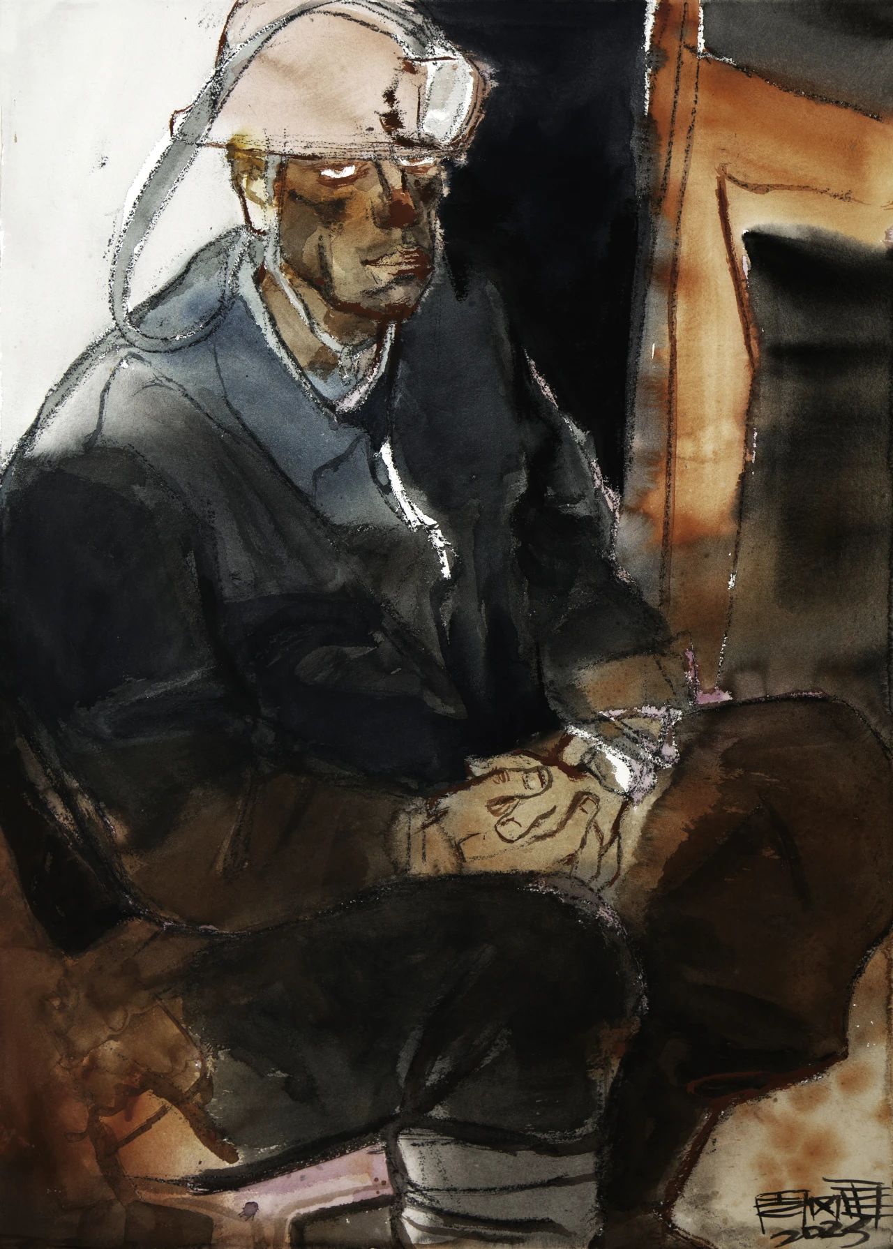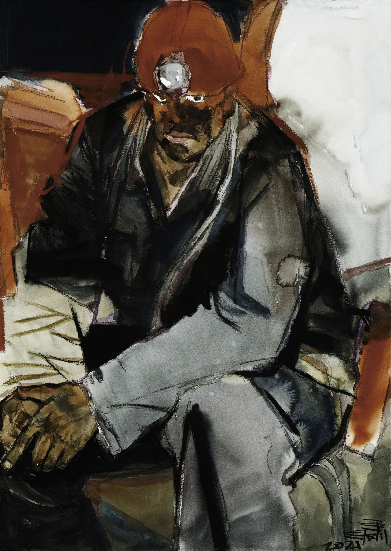 (《山西雄山溝里礦礦工楊忠平》105x75cm,水彩畫,2022 )