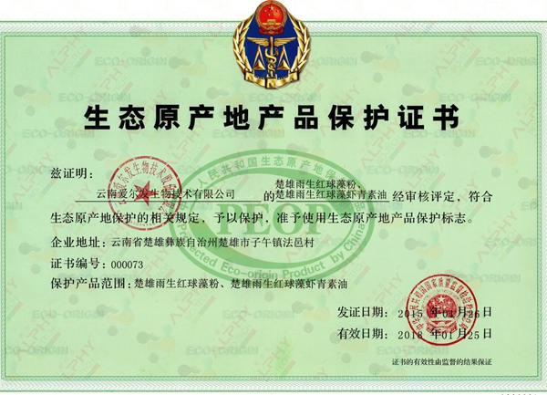 在地方政府的大力支持下,2007年起,愛爾發(fā)楚雄雨生紅球藻產(chǎn)業(yè)展現(xiàn)出蓬勃的生命力。2010年,愛爾發(fā)承擔(dān)了科技部的火炬計(jì)劃項(xiàng)目,成功實(shí)現(xiàn)了年產(chǎn)50噸楚雄紅球藻藻粉的產(chǎn)業(yè)化目標(biāo)。2013年,云南省發(fā)展和改革委員會(huì)授予愛爾發(fā)“云南雨生紅球藻工程研究中心”的稱號(hào),認(rèn)可了其在紅球藻領(lǐng)域的技術(shù)領(lǐng)先地位。2014年,“侯寶榮院士工作站”在愛爾發(fā)設(shè)立;2015年,云南首個(gè)國(guó)家生態(tài)原產(chǎn)地保護(hù)產(chǎn)品落戶楚雄,國(guó)家質(zhì)檢總局2015年第9號(hào)公告,批準(zhǔn)云南愛爾發(fā)生物技術(shù)股份有限公司的楚雄雨生紅球藻粉、楚雄雨生紅球藻蝦青素油為生態(tài)原產(chǎn)地保護(hù)產(chǎn)品,準(zhǔn)予其使用生態(tài)原產(chǎn)地產(chǎn)品保護(hù)標(biāo)志。此項(xiàng)殊榮的獲得,實(shí)現(xiàn)了云南省生態(tài)原產(chǎn)地保護(hù)產(chǎn)品零的突破,該產(chǎn)品也是目前全國(guó)唯一獲得生態(tài)原產(chǎn)地保護(hù)的生物技術(shù)產(chǎn)品。