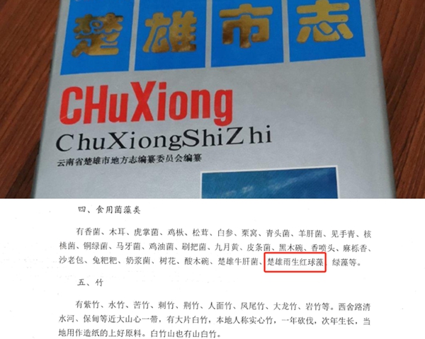 1993年12月,93版《楚雄市志》正式出版,楚雄雨生紅球藻首次以官方文獻(xiàn)的形式被記錄在冊(cè)。在地方志的第三章第三節(jié)中,這種微藻與楚雄牛肝菌、綠藻、樹花等珍貴食材并列,被明確歸類為楚雄市獨(dú)特的食用菌藻類資源。雖然該志書沒有詳細(xì)記載楚雄雨生紅球藻的具體棲息位置、生存環(huán)境及詳細(xì)特征,但這一里程碑式的記載,不僅標(biāo)志著楚雄雨生紅球藻正式獲得了官方的認(rèn)可與保護(hù),也預(yù)示著其在楚雄農(nóng)業(yè)開發(fā)、生態(tài)保護(hù)及健康產(chǎn)業(yè)等領(lǐng)域?qū)碛袕V闊的發(fā)展前景。