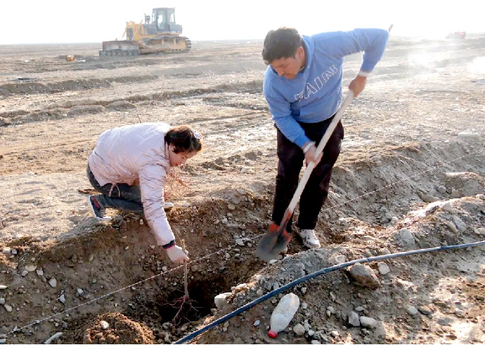 拜城縣亞吐爾鄉(xiāng)村民吐爾遜?居曼說:“我是亞吐爾英蘭干村的村民,我到這個地方來種樹的,今天已經(jīng)三天了,一天掙150元左右,我們村的村民都來這個地方掙錢。”