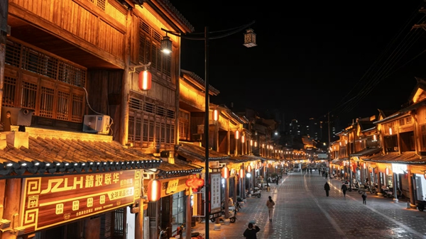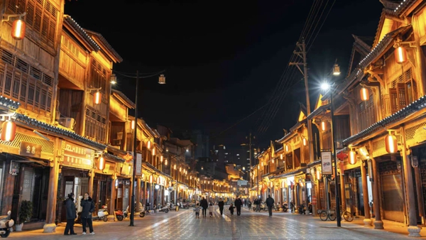 云南省文山州廣南縣古城南街素有“白天一幅景,晚上一幅畫”之稱,暖黃的燈光映照著古建筑的飛檐斗拱、雕梁畫棟,仿佛在訴說著往昔的繁華盛景。