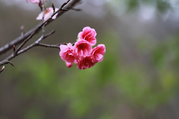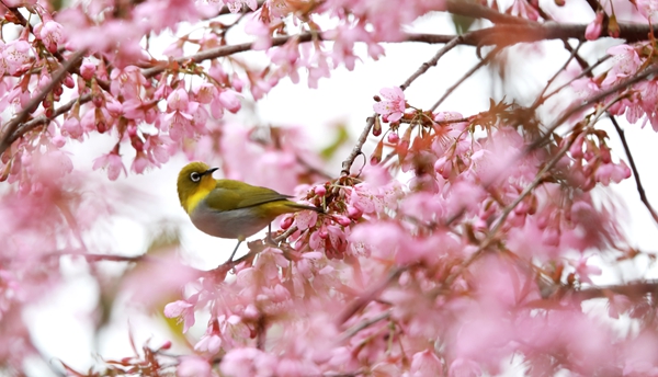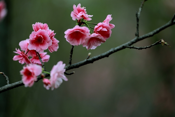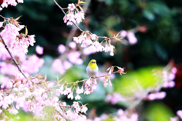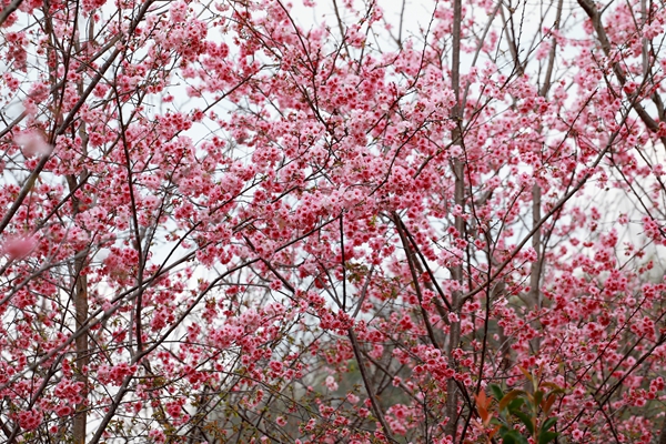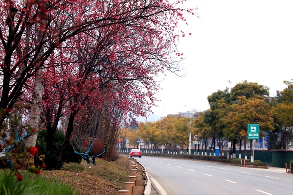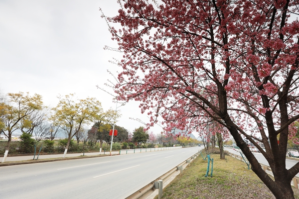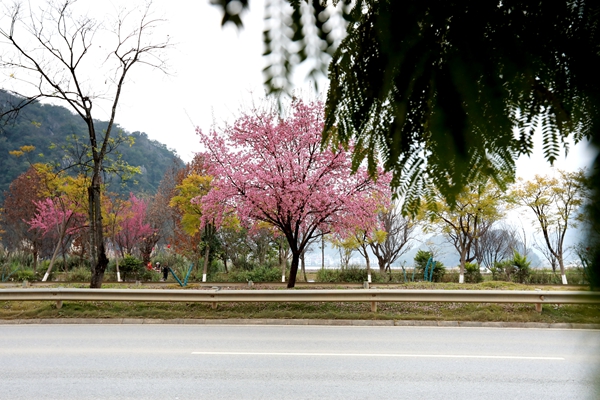 在景區(qū)貓貓沖、七零新村的道路沿線,一簇簇冬櫻花在枝頭搖曳生姿,如粉色云霞般絢麗。