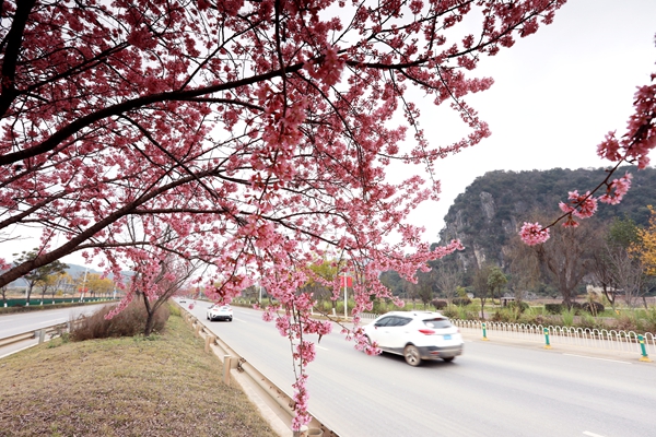 在樂水洞、八道哨鄉(xiāng)豹子坡、矣堵村道路兩旁,熱情的冬櫻花爭相盛開,花瓣隨風(fēng)飄落,地面好似鋪上了一層柔軟的花毯,行人漫步其間,盡情享受普者黑景區(qū)的冬日獨(dú)特美景。(馬衛(wèi)忠、丘北縣委宣傳部供稿)
