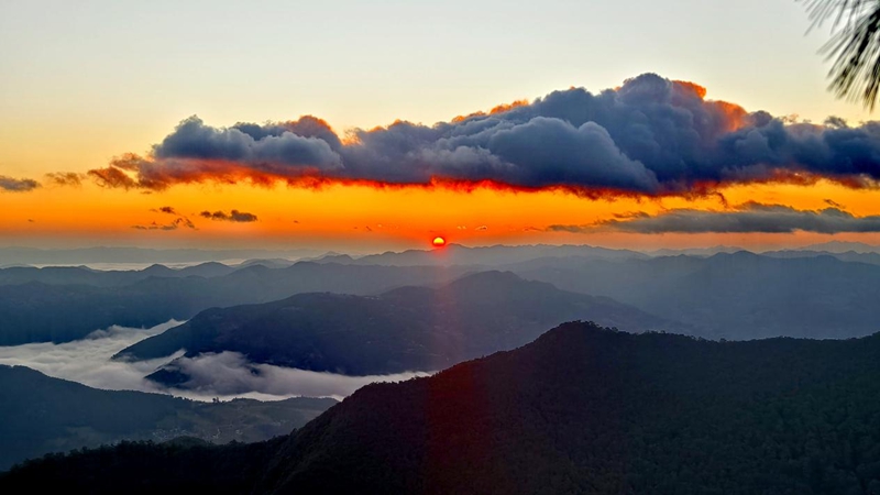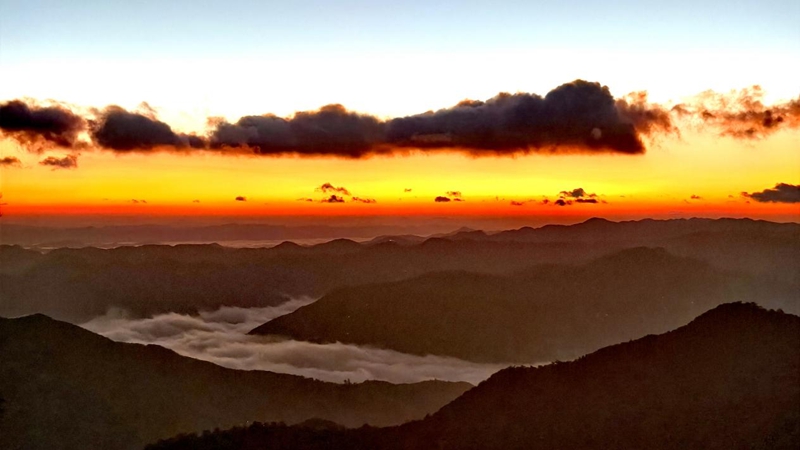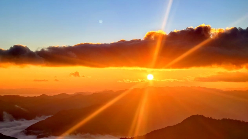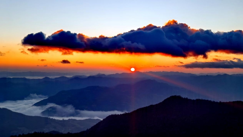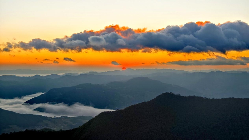 冬日晨曦,在云南省楚雄彝族自治州楚雄市樹苴鄉(xiāng)三尖山可以邂逅云海日出的壯美景觀,置身于山巔,山谷間云海翻滾,天邊太陽冉冉升起,橙紅色的陽光、雪白色的云海和黛綠色的群山瞬間構(gòu)成一幅美麗的油畫,引人遐想,令人回味。(王成紅、羅歡、王學(xué)鴻)