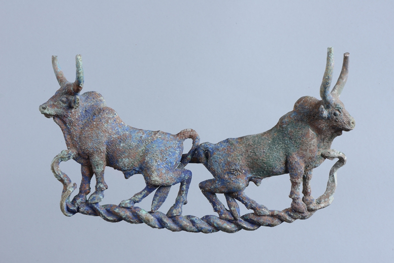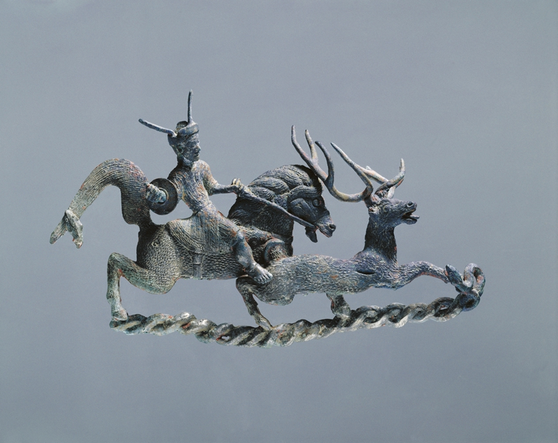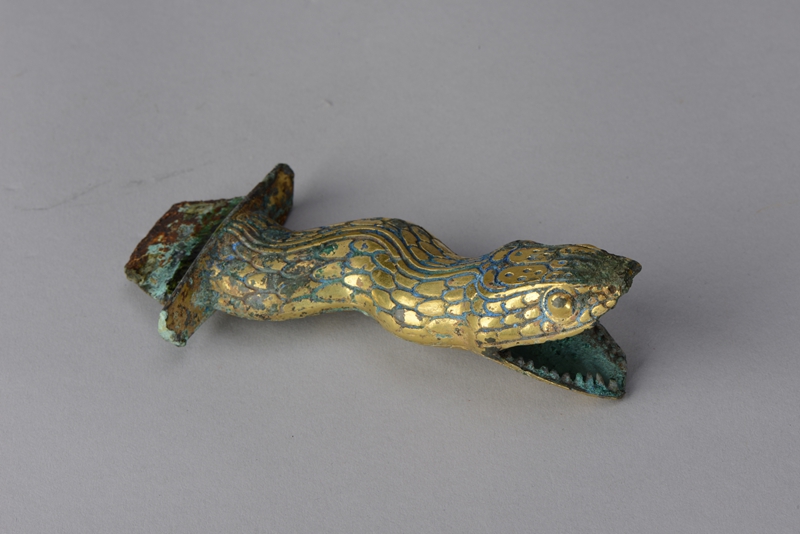 出土于云南李家山的幾十件蛇形文物中,動物造型的文物較多,有蛇形象的文物也不少。其中,二牛銅扣飾、立豹銅扣飾、立熊銅扣飾、騎士獵鹿銅扣飾、喂牛銅扣飾、蛇圍邊長方形銅扣飾、蛇綱網(wǎng)狀銅器、蛇頭銎銅叉、蛇頭銎銅鏟、鎏金蛇頭形劍柄等文物極具代表性,它們有的是兵器,有的是生產(chǎn)工具,還有些是扣飾,或以圖案又或以雕塑呈現(xiàn),無不形態(tài)逼真,神秘莫測。