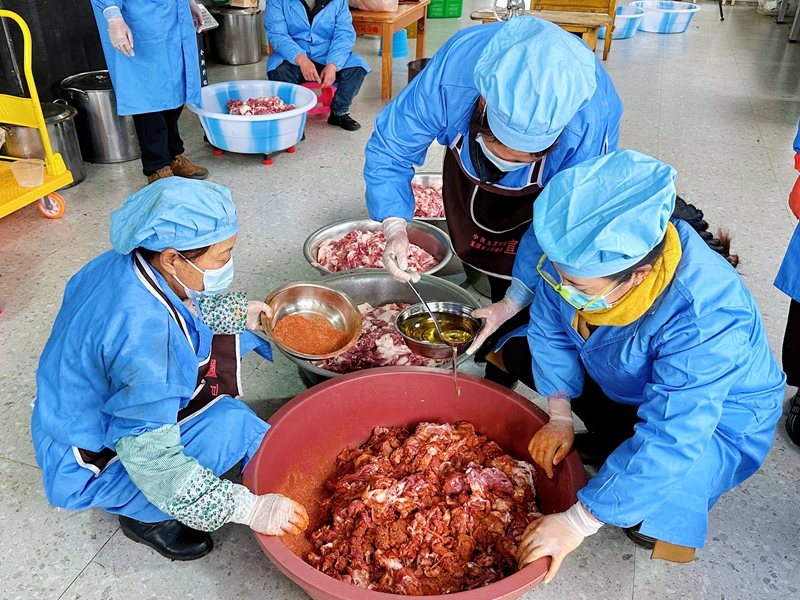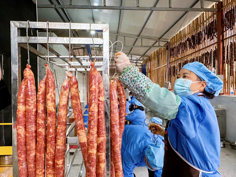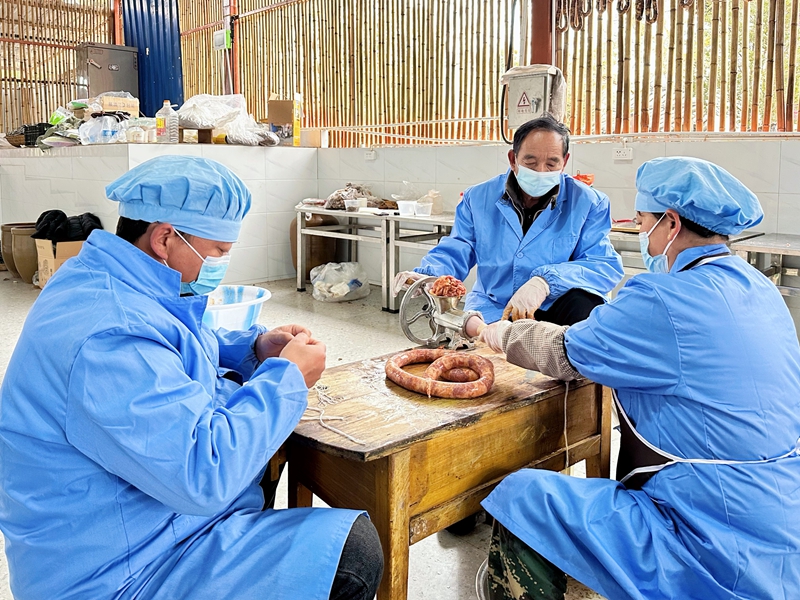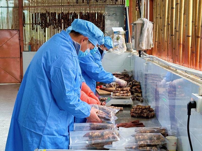春節(jié)臨近,黃草壩村的村辦公司——玉溪高寒綠特農(nóng)業(yè)發(fā)展有限公司訂單量持續(xù)增加,工作人員早早便開始忙碌起來。切鮮肉、調(diào)佐料、腌臘肉、洗腸衣、裝香腸……每一道工序都堅持純手工制作,腌制出的臘味既新鮮又保留了原始醇厚的口感,這便是黃草壩臘味走俏市場的“秘訣”所在。腌好的香腸臘肉經(jīng)自然風干后,便可分裝打包,搭配其他土特產(chǎn)品裝盒銷售。
