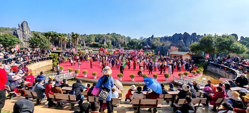 據(jù)統(tǒng)計,春節(jié)期間石林風(fēng)景區(qū)接待游客數(shù)量23.48萬人次。游客們對春節(jié)民俗活動給予了高度評價,紛紛表示在石林度過了一個歡樂、充實且充滿民俗風(fēng)情的春節(jié)。(王建平)