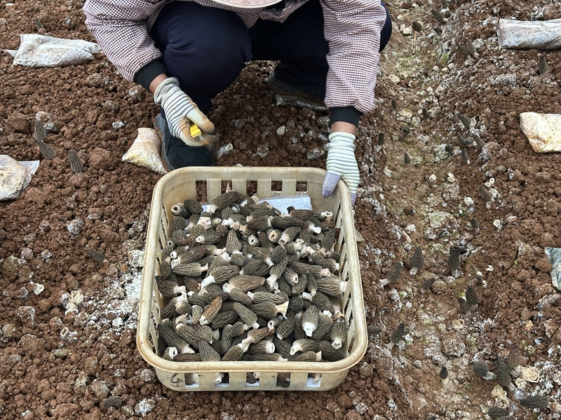 在羊肚菌種植基地內(nèi)的大棚里,隨處可見密密麻麻的褐色“小傘”,幾名工人穿梭在菌壟間,仔細挑選成熟肥厚的羊肚菌,用小刀輕輕割下,不一會兒就裝滿了整個菌筐。新鮮采摘的羊肚菌經(jīng)過打包分裝,當天就可送到昆明的野生菌交易市場,或者通過冷鏈運輸發(fā)往省外進行銷售。