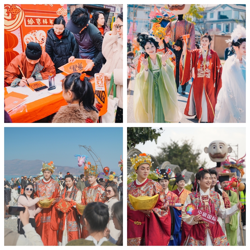 原創(chuàng)互動劇《徐霞客游記——遇見大理》也在廊道以快閃形式展現(xiàn),徐霞客扮演者與白族風(fēng)、花、雪、月四位女子互動,展示大理自然風(fēng)光和獨特魅力;洱海生態(tài)廊道龍龕古渡,福祿壽喜財五大天官穿梭在人群中與游客互動,贈送小禮品傳遞新春祝福,“財神辦事處”和“月老辦事處”吸引了各方游客的拍照打卡;落日時分,龍龕日落音樂會在海風(fēng)與余暉相伴下,響起動人的旋律,節(jié)奏明快的白族打跳瞬間引爆現(xiàn)場;陽南溪入口市民游客參加書法春聯(lián)、非遺甲馬體驗,將美好祝福帶回家,活動期間還有賣貨郎挑著各種新奇小玩意兒四處游走;活動拍照打卡點吸引了不少游客的駐足,大家紛紛拍照留念,享受新春團(tuán)圓的喜悅。