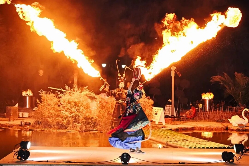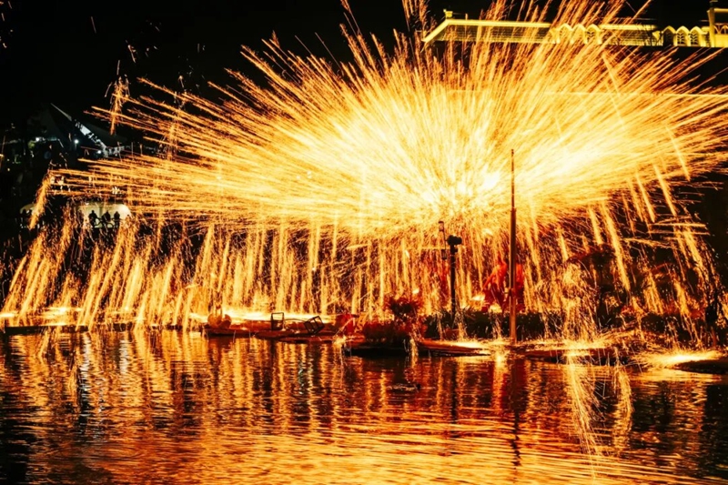 今年鳳龍灣童話(huà)鎮(zhèn)以“燃情巳火”為主題,首次將非遺打鐵花技藝與創(chuàng)新火舞劇《鳳龍灣傳奇》深度融合。1600℃高溫鐵水潑灑出的“火樹(shù)銀花”,與融合黑神話(huà)悟空、火裙舞等元素的舞臺(tái)表演交相輝映,為游客呈現(xiàn)了一場(chǎng)視覺(jué)與文化的雙重盛宴。