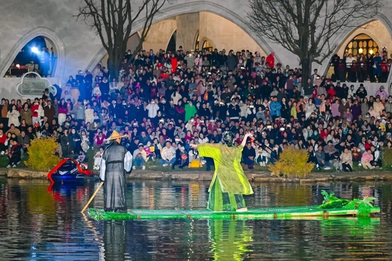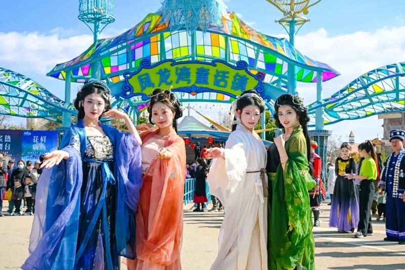 鳳龍灣童話(huà)鎮(zhèn)工作人員王玉梅介紹,“春節(jié)期間,鳳龍灣童話(huà)鎮(zhèn)為游客呈現(xiàn)了水上非遺火壺、春節(jié)首秀火舞劇、漢服秀、小丑表演、腹語(yǔ)表演等系列精彩節(jié)目?!?/p>
