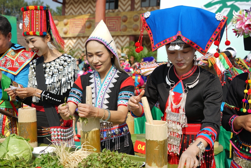活動現(xiàn)場,在“瑙雙”“瑙巴”的帶領(lǐng)下,景頗族群眾以螺旋形隊形演繹出震撼人心的萬人之舞。此外,“萬物皆可舂——景頗綠葉宴體驗活動”也吸引了眾多游客。