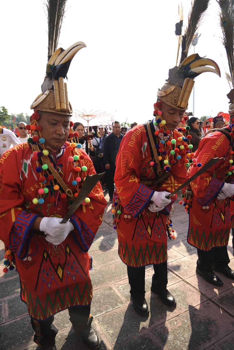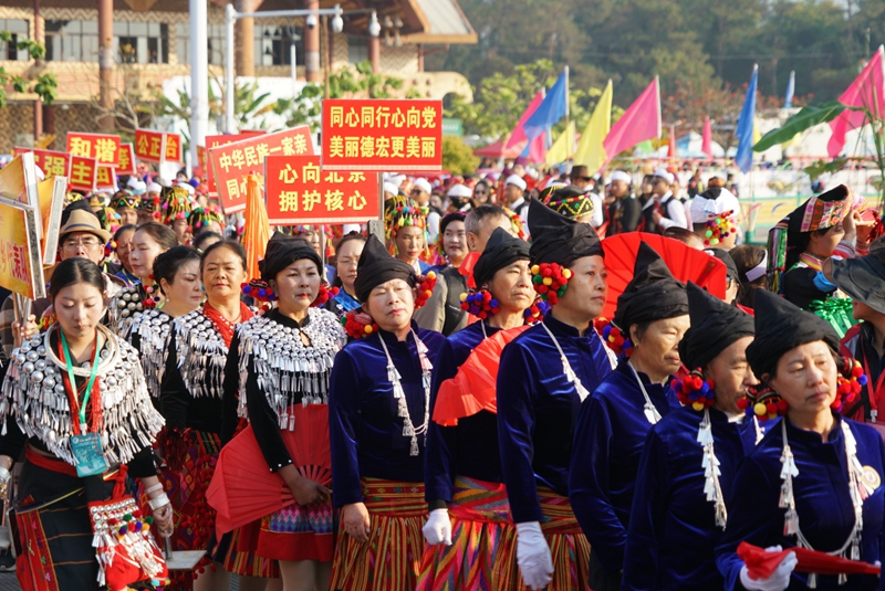 目瑙縱歌意為“大家一起來跳舞”,是國家級非物質(zhì)文化遺產(chǎn)。在德宏州景頗族聚居地,每年正月十五前后就是目瑙縱歌節(jié),村村寨寨都要舉辦目瑙縱歌,這也是景頗族為家鄉(xiāng)風調(diào)雨順、五谷豐登、六畜興旺等祈福的盛典。更展現(xiàn)了景頗族的歷史起源、宗教信仰等文化藝術(shù)特點,充分體現(xiàn)出景頗族樂觀進取、團結(jié)一心的民族精神。(周佳藝)