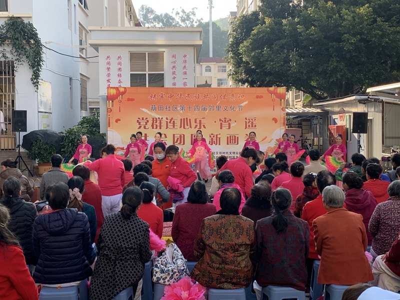 當(dāng)天上午,在葫田社區(qū)居民委員會院內(nèi),社區(qū)工作人員和志愿者們早早布置好活動場地,迎接社區(qū)居民的到來。開幕式后,活動在舞蹈《吉祥中國年》中熱鬧開場,多支由社區(qū)文藝愛好者組成的文藝隊輪番上陣,帶來舞蹈、花燈、詩歌朗誦等精彩的文藝節(jié)目。