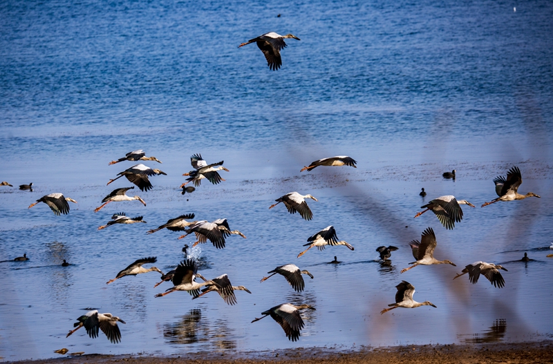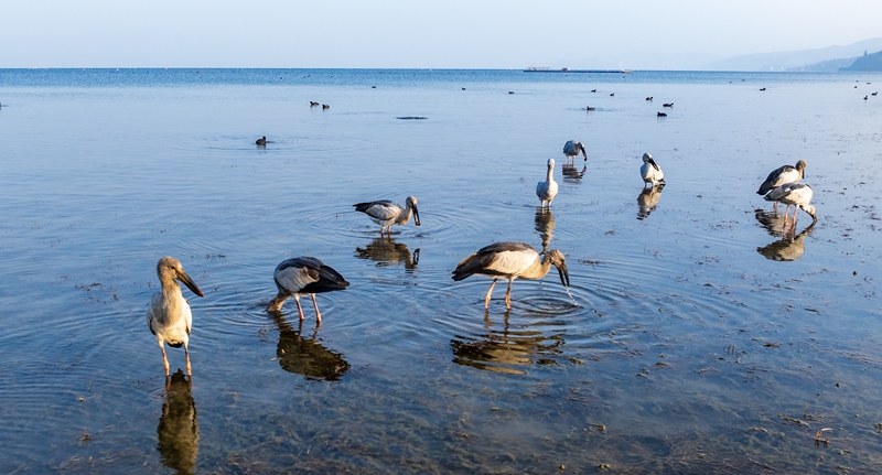 近日,云南省玉溪市撫仙湖來了一群特殊的“客人”,上百只鉗嘴鸛到濕地“踏春”。