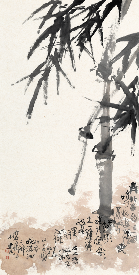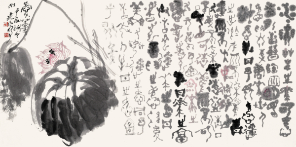 無(wú)論是書法還是繪畫,其核心都在于筆墨。欣賞杜建民的《此君淡若》、《不可一日無(wú)竹》、《山中塘伴燈心》等作品,我們能看到他雖然傳承了傳統(tǒng)文人畫脈絡(luò),但明顯與文人畫秀美空靈的筆墨拉開了距離。如《愛蓮說(shuō)》等作品中,杜建民創(chuàng)造性的將寫意甲骨與詩(shī)、畫、印相結(jié)合,這種新形式的探索深入挖掘了傳統(tǒng)筆墨形態(tài),拓寬了筆墨語(yǔ)言的表現(xiàn)力,在繼承傳統(tǒng)的基礎(chǔ)上創(chuàng)造出了屬于自己的獨(dú)特風(fēng)格。