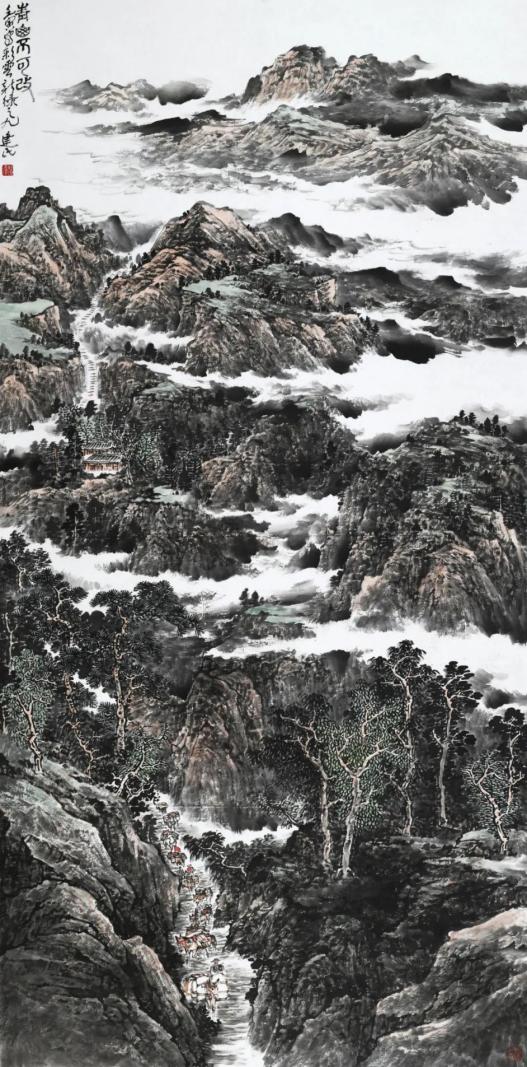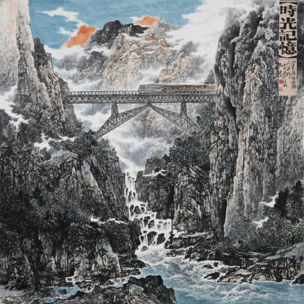 例如其畫作《時(shí)光記憶之二》,畫面中一輛列車緩緩駛過(guò)橫跨于山峰絕壁之間的滇越鐵路。高聳入云的山巒,奔騰不息的河流與牢固的人字型鐵路橋形成了鮮明對(duì)比,大氣磅礴的畫面令觀者感受到一種不畏艱險(xiǎn),永往直前的信念和力量。他筆下的昆明八景、怒江、石林……這些山水畫與傳統(tǒng)文人畫多取荒寒蕭疏之景、殘山剩水之境不同,無(wú)不體現(xiàn)出新時(shí)代的大氣象,大趣味,可以說(shuō)這種廣闊的胸襟和非凡的氣度在當(dāng)今畫壇實(shí)屬可貴。
