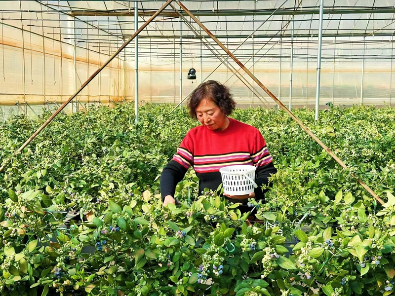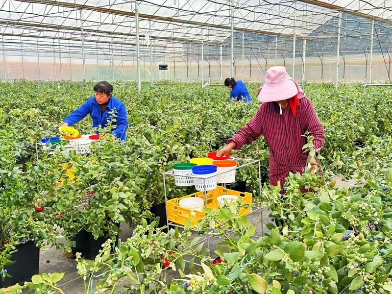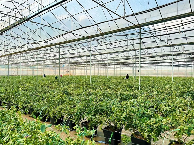 洛河鄉(xiāng)海拔1850米,光照充足,晝夜溫差大,為藍(lán)莓的生長(zhǎng)創(chuàng)造了絕佳條件。2024年,園區(qū)利用新建成的50畝高標(biāo)準(zhǔn)大棚,采用無(wú)土基質(zhì)栽培的方式栽種了26000盆花香藍(lán)莓。相比傳統(tǒng)的種植方式,無(wú)土栽培更好管理、更省人工且見(jiàn)效快、收益高,當(dāng)年栽種次年即可掛果,畝均收益提升2倍以上。目前,基地日采摘量在70至80公斤,預(yù)計(jì)盛果期單日可采摘1.5噸,批發(fā)價(jià)每公斤80至100元。自去年12月底成熟以來(lái),采摘期可持續(xù)至今年4月中旬。
