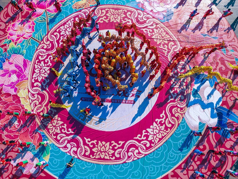 啟動儀式后,10條顏色各異的長龍高昂龍頭,氣勢磅礴地相繼“飛”出,時而上下翻騰、時而交會盤旋,群龍共舞的震撼場面瞬間點燃了現(xiàn)場氣氛。伴隨著歡快的音樂,一條條彩帶龍在舞者手中靈動飛舞。彩綢飄揚,似蛟龍出海,時而盤旋、時而穿梭,熱烈歡騰,整個廣場沉浸在喜慶歡樂的熱潮之中。