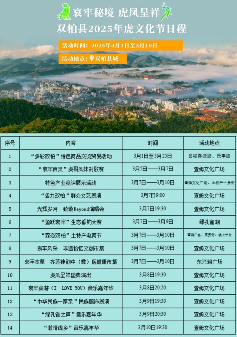 活動期間,將開展“虎鳳呈祥”盛典演出、“活力雙柏”群眾文藝展演、“哀牢百靈”虎哥鳳妹對歌賽、“多彩雙柏”特色商品交流貿(mào)易活動等十四個系列活動。