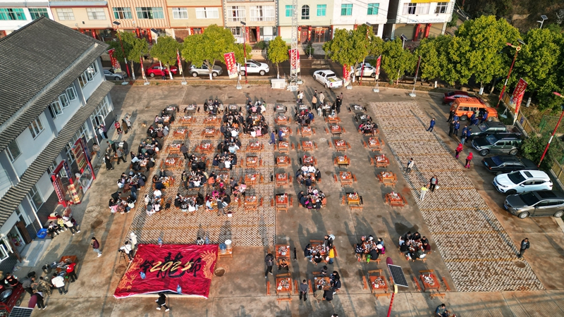 在洛河鄉(xiāng)集鎮(zhèn)民族團(tuán)結(jié)進(jìn)步示范廣場(chǎng),本次祭龍節(jié)的重頭戲——長街宴,以彝家特色迎賓儀式“三碗攔門酒”拉開序幕。長街宴共預(yù)定了90余桌,為了將洛河特色美食更好地呈現(xiàn)給食客們,長街宴菜肴制作由洛河鄉(xiāng)5個(gè)村委會(huì)共同籌辦和制作并參加創(chuàng)意特色菜等獎(jiǎng)項(xiàng)評(píng)比,活動(dòng)現(xiàn)場(chǎng),敬酒歌和拉票聲此起彼伏,熱鬧非凡。