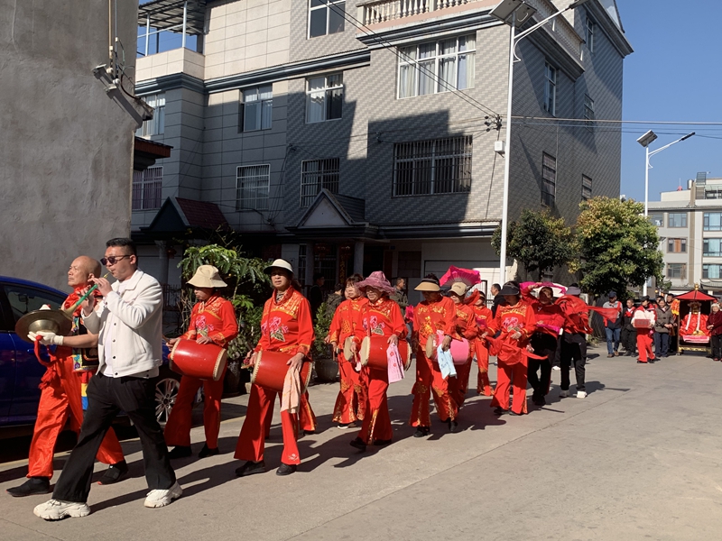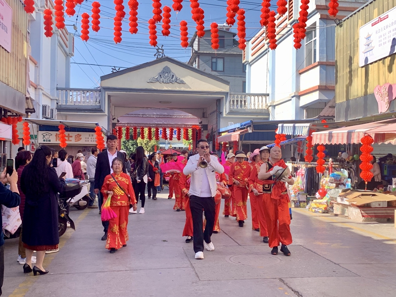 當天上午,劉總旗社區(qū)鑼鼓喧天、嗩吶悠揚、鞭炮陣陣,“土主送福,萬戶迎?!钡挠林鲀x式正式拉開了劉總旗社區(qū)米線節(jié)的序幕,居民們早早守候在自家門口,迎接土主,祈求新的一年風調(diào)雨順、國泰民安、家庭幸福。
