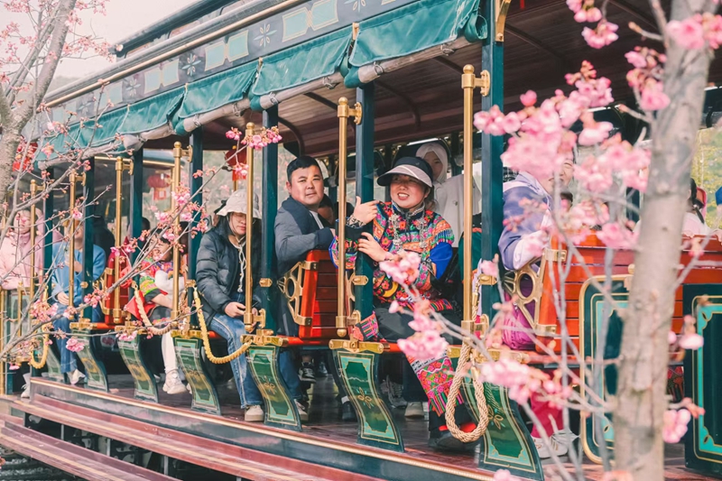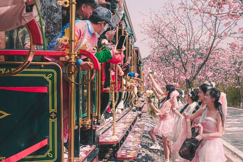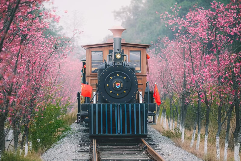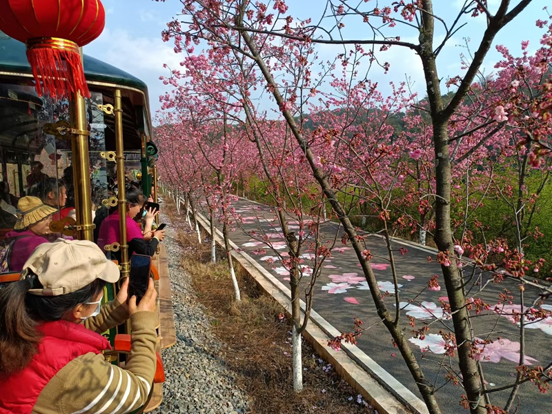 “坐著火車賞櫻花”是游客在鳳龍灣必解鎖的春日限定體驗,能讓游客們近距離感受鳳龍灣春天的氣息與櫻花的浪漫。