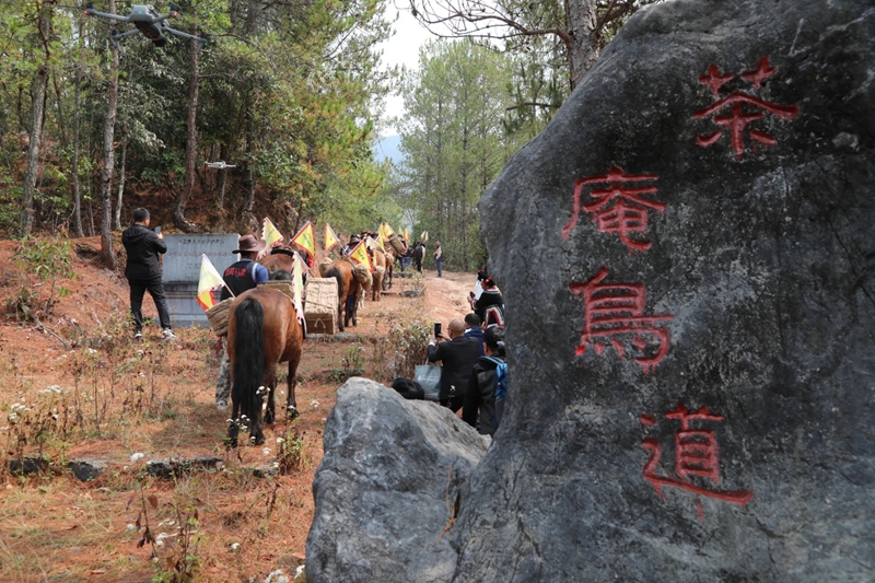 在“茶馬古道?瑞貢京城20周年紀念”重走茶馬古道活動上,由茶企代表、愛茶人士、游客等組成的馬幫隊伍,從“茶馬古道零公里碑”出發(fā)沿“茶庵鳥道”從古普洱府通往省城昆明直至京城的第一個驛站“茶庵塘”行進,陣陣馬鈴聲中,再現(xiàn)了馬幫馱茶進京的歷史場景。
