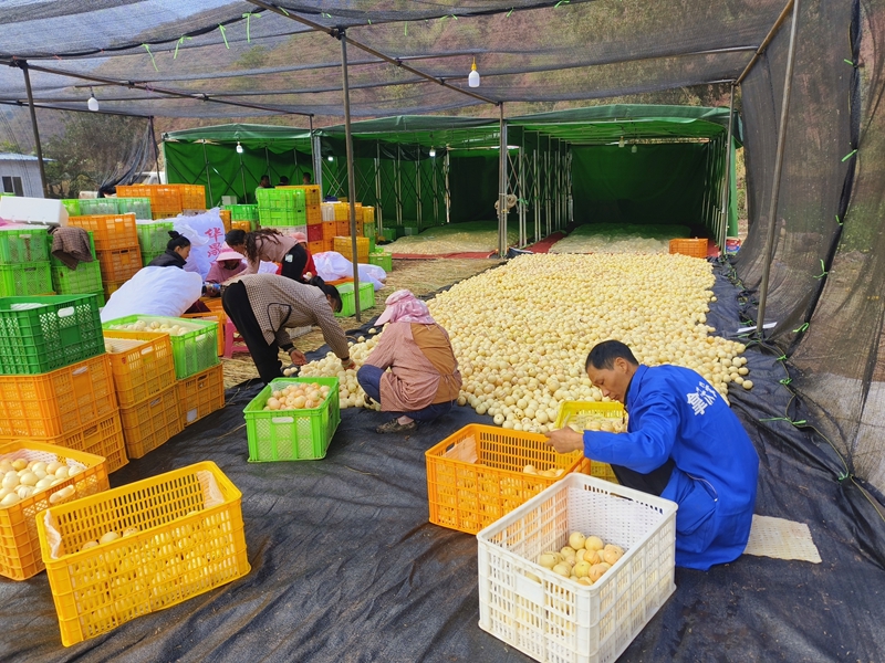 馬龍河的春天,氣溫已經(jīng)明顯升高,流域內(nèi)也是一片熱鬧的景象,人參果金黃的果實(shí)掛滿枝頭,在陽(yáng)光下閃耀著豐收的氣息。農(nóng)戶們正忙著采摘、分揀,趕上冬季人參果的最后一波豐收。