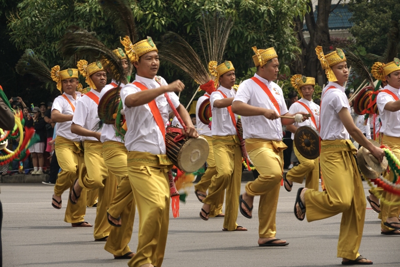 4月12日,云南省德宏州芒市街頭鑼鼓喧天、歌舞飛揚,中華民族優(yōu)秀傳統(tǒng)文化巡演活動拉開了芒市潑水狂歡節(jié)序幕。