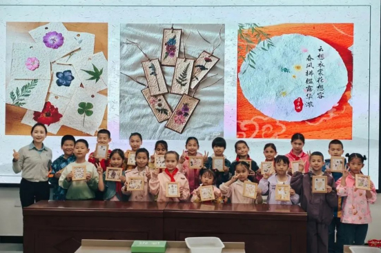 在實(shí)踐環(huán)節(jié)中,學(xué)生們?cè)谡禄蹪嵗蠋煹闹笇?dǎo)下,通過搗漿、抄紙等工序,親歷古法造紙十二道核心技藝。同學(xué)們手持小木棍輕剔網(wǎng)篩邊緣余漿,將薰衣草、銅鈴花等新疆特色干花嵌入紙漿。隨著紙漿漸干,20張“石榴籽紙”躍然眼前,只見紫穗輕曳的薰衣草與江南古楮纖維相融,在方寸間定格胡楊精神與江南風(fēng)韻的交響,紙面紋理恰似文化交融的年輪。