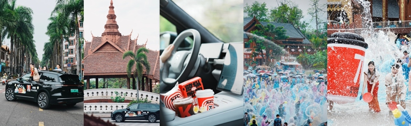 其中,肯德基與蔚來共同打造的潑水節(jié)主題巡游車穿梭于芒市傣族古鎮(zhèn)、西雙版納黎明大橋、潑水廣場、傣族園等熱門景點,邀請游客體驗自駕潑水節(jié)及肯德基便捷車速取的車行用餐場景;在西雙版納傣族園景區(qū),更有肯德基KCOFFEE移動餐車成為“清涼補給站”,餐車提供現(xiàn)磨咖啡、果汁及冰淇淋,游客體驗潑水狂歡的同時,可隨時享受“舌尖上的清涼”。潑水節(jié)期間,巨型肯德基全家桶、肯悅咖啡桶隨機“出沒”于西雙版納各大潑水狂歡區(qū),成為潑水節(jié)“顯眼包”和“打卡神器”,游客紛紛與巨型全家桶同框潑水,記錄歡樂時刻。