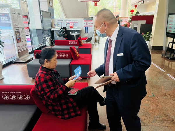 (工商銀行社銀服務(wù)網(wǎng)點(diǎn)工作人員為群眾講解社保政策)