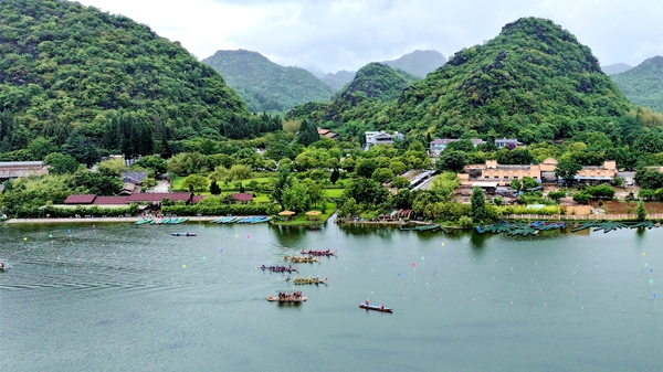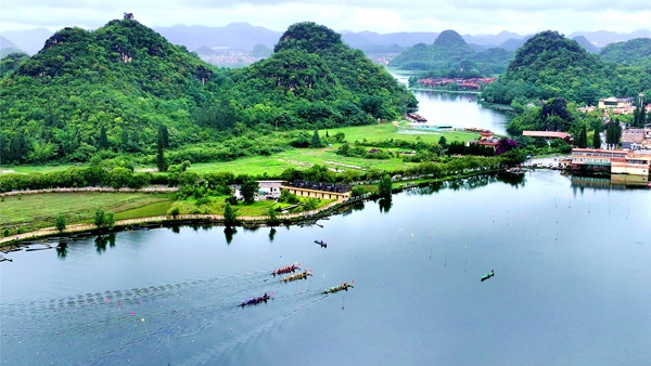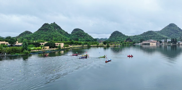 5月29日下午,在云南文山丘北普者黑景區(qū),來(lái)自全縣各行各業(yè)的80支隊(duì)伍1500余人同場(chǎng)競(jìng)技,在喀斯特山水田園上演一場(chǎng)速度與激情較量的龍舟賽。