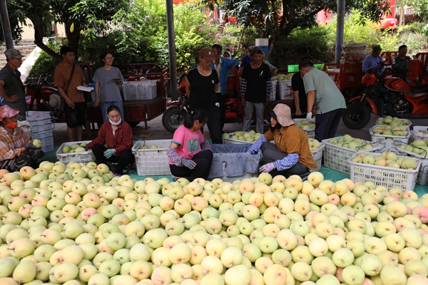 收購商黃元新介紹:“我來收水果已經(jīng)20多天了,主要是發(fā)往北京、廣州等一線城市,每天的量基本上都是17到18噸,今年的價格比較穩(wěn)定,算好的?!?/p>
