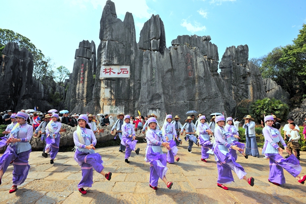 除了絕美的自然景觀,石林還承載著深厚的文化底蘊(yùn)。在這里,每一塊石頭都訴說著億萬年的時(shí)光故事,每一縷風(fēng)都帶著阿詩瑪?shù)膫髡f。當(dāng)暮色降臨,熱情好客的撒尼人燃起篝火,鮮艷的刺繡服飾在火光中翻飛,跟著歡快的大三弦節(jié)奏起舞,讓這個(gè)夏天綻放最熾熱的色彩。